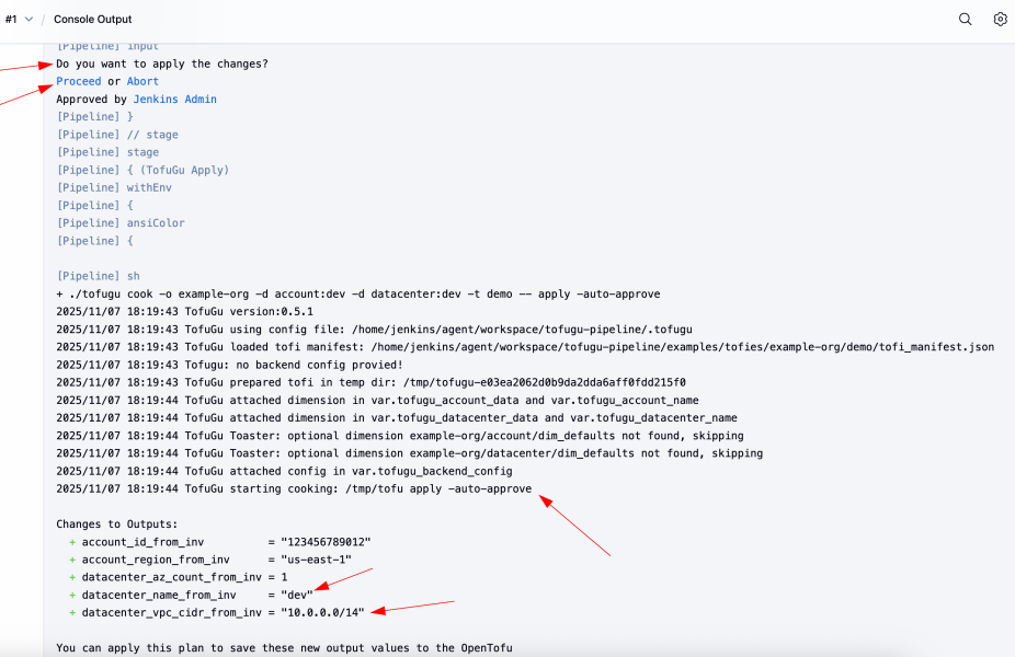 Scroll to the end of the console output. You should see a plan output from OpenTofu and a question: "Do you want to apply the changes?".